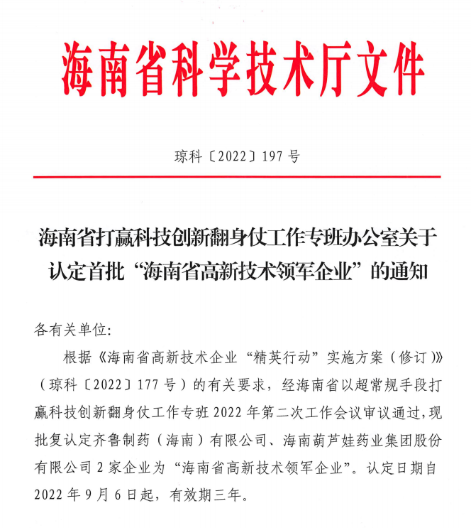 近日,海南省科学技术厅发布的《海南省打赢科技创新翻身仗工作专班办公室关于认定首批“海南省高新技术领军企业”的通知》中显示,批复认定海南万利药业集团股份有限公司等2家企业为“海南省高新技术领军企业”。认定日期自2022年9月6日起,有效期三年。