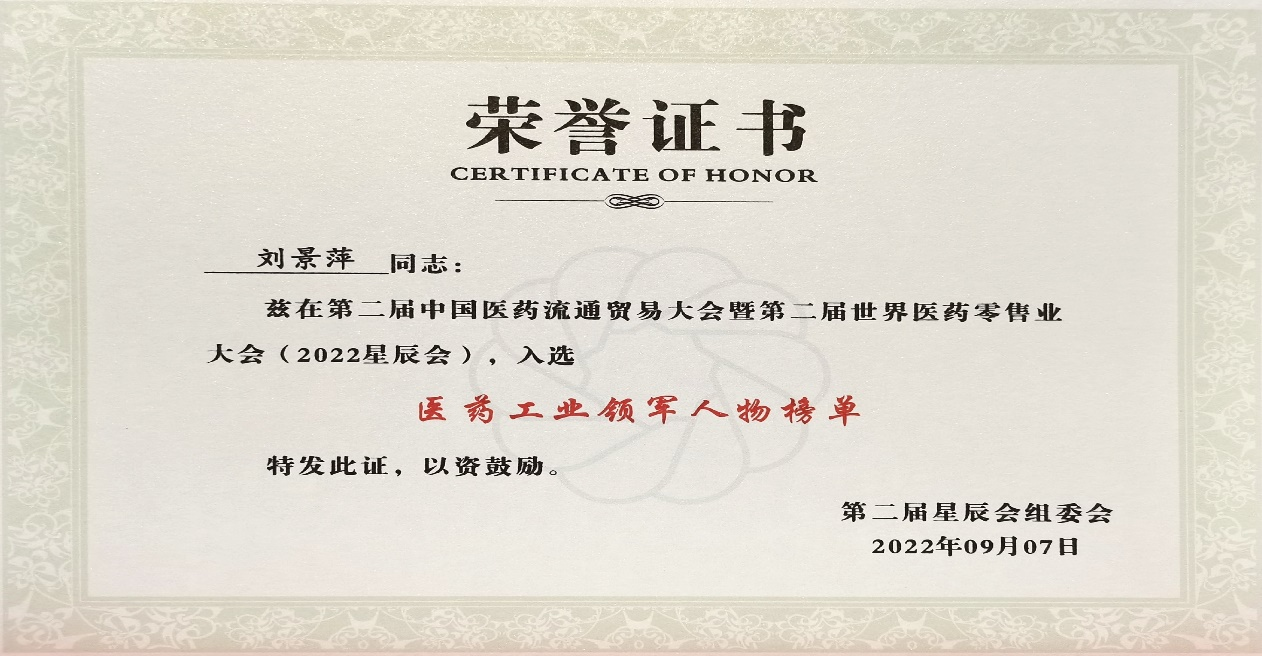 本次星辰会期间,万利斩获颇丰,获得多项行业奖项及荣誉。在开幕式上,刘景萍董事长荣获“医药工业领军人物”称号。